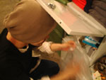ロッカー内のゴミ袋を取るのに頭で扉を支えるという